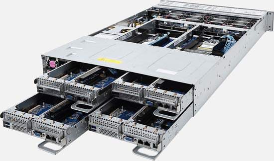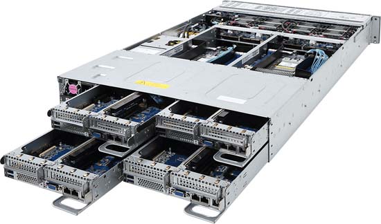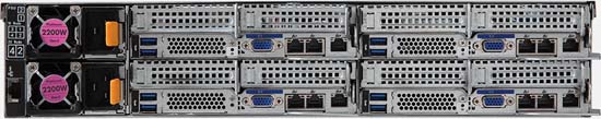 2U - 4 nodes with rear access to the node trays, 24x SATA/SAS hot-swappable HDD/SSD bays, redundant power option