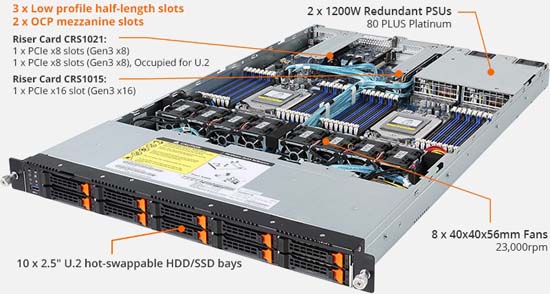 10x 2.5" NVMe hot-swappable SSD bays, 2x low profile PCIe Gen3 expansion slots, redundant power option