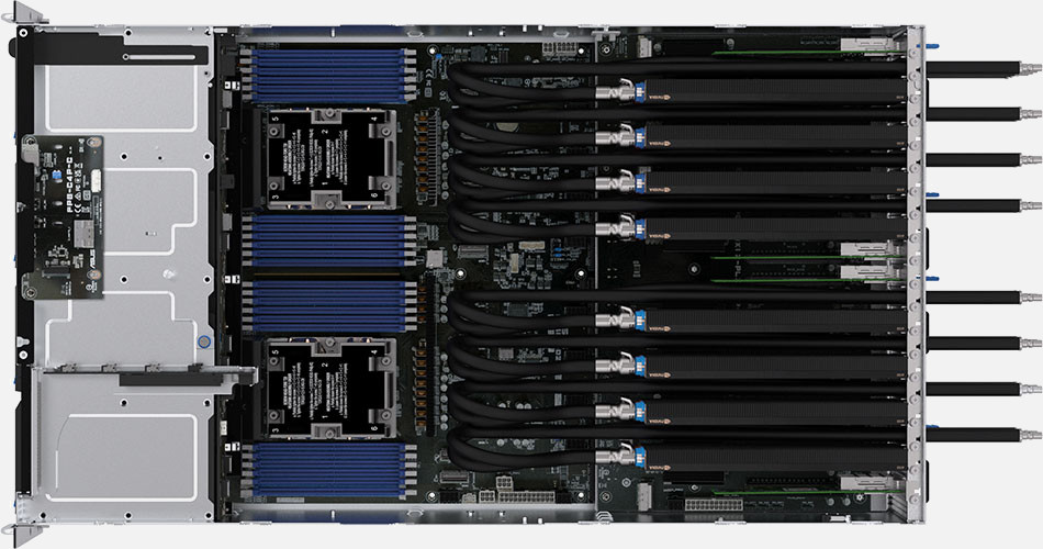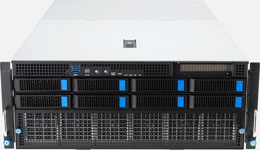 Dual AMD EPYC 9004 Series Processors, Supports up to 8x double slot GPU cards, Quad 2600W redundant power supply, 8x 3.5"/2.5" NVMe/SATA/SAS hot-swappable drive bays.