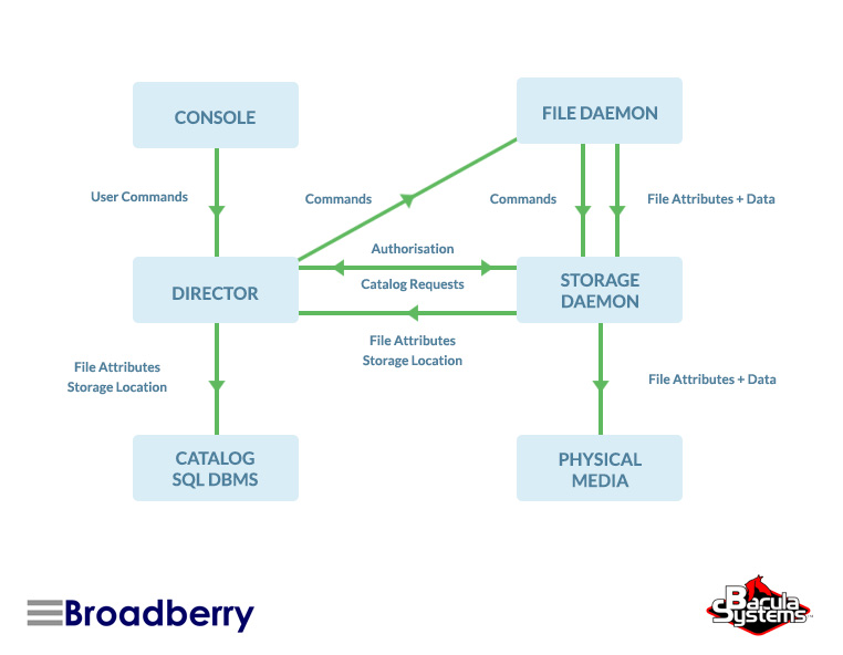 The Bacula Storage service are made up of software programs that execute the storage and recovery of the file attributes and data to the physical backup media and volumes. Essentially, the Storage daemon reads and writes to your storage target, for example tapes (or other storage object / media).