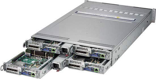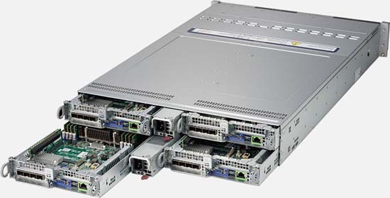 Four hot-swappable nodes in 2U, ideal for compute intensive applications and HPC, 2x PCI-E 3.0 x16 (LP) slot, IPMI 2.0 + KVM with dedicated LAN.