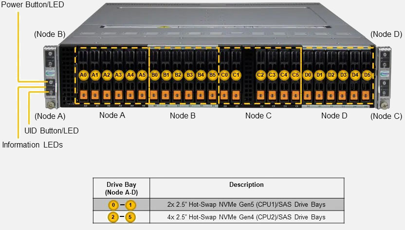 Ideal for Hyperconverged Infrastructure, Application Accelerator and Diskless HPC Clusters. Quad Node 2U Form Factor. Redundant 3000W Power Supply, 6x 2.5" hot-swap NVMe/SAS drive bays (Per Node)