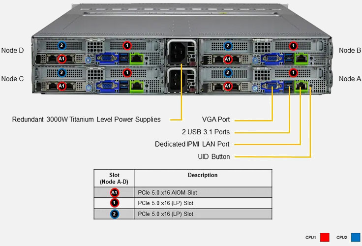 Ideal for Hyperconverged Infrastructure, Container Storage and Scale-Out File Server. Quad Node 2U Form Factor. Redundant 3000W Power Supply, 3x 3.5"/2.5" hot-swap NVMe/SATA drive bays (Per Node)