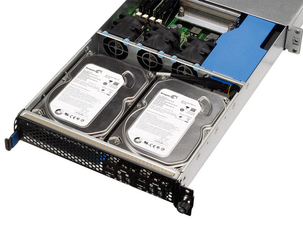 Each processor is equipped with four DIMM sockets, with the 3420 chipset supporting a maximum of 32GB of 1,333MHz DDR3 memory. The chipset also has an embedded RAID controller that supports stripes, mirrors and RAID5 arrays, although with only one drive per node this is academic.