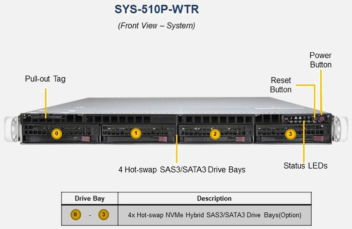 • 4x hot-swap 3.5'' Hybrid SATA3/NVMe drive bays, SAS3 with additional SAS controller card; Onboard 1x NVMe/SATA M.2