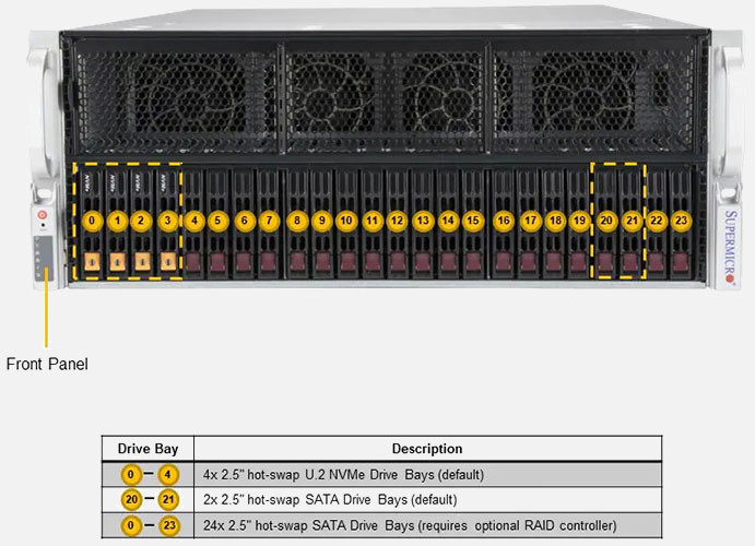 The Supermicro GPU A+ Server 4125GS-TNRT | AS-4125GS-TNRT features hot-swap hard drives, giving you more flexibility and allowing you to remove drives without having to shut down the system.