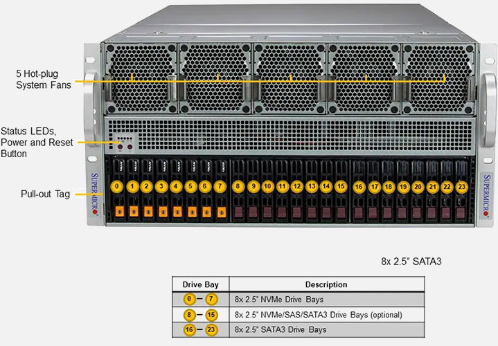 The Supermicro GPU SuperServer 521GE-TNRT | SYS-521GE-TNRT features hot-swap hard drives, giving you more flexibility and allowing you to remove drives without having to shut down the system.