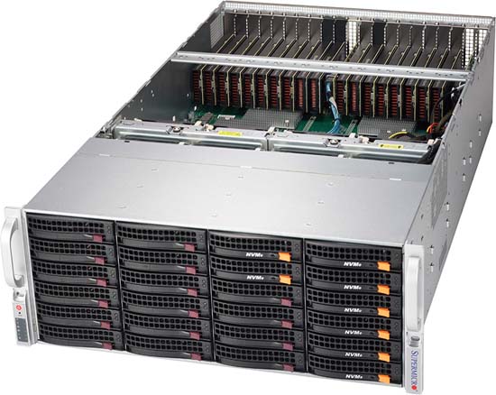 20x PCI-E 3.0 x16 supporting up to 20x Single Width GPU; 1x PCI-E 3.0 x8 (FH, FL in x16 slot), 24x Hot-swap 3.5" drive bays (2x Optional U.2 NVMe 2.5" drives), 2x 10GBase-T LAN ports via Intel C622