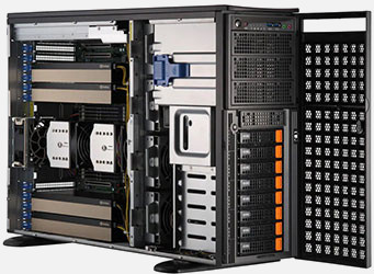 Ideal for HPC, AI, Deep Learning, cloud gaming, VDI, rendering and animation. 13x PCI-E 5.0 x16 slots. Redundant 2700W Titanium Power Supply, 8x 3.5"/2.5" hot-swap NVMe/SATA drive bays