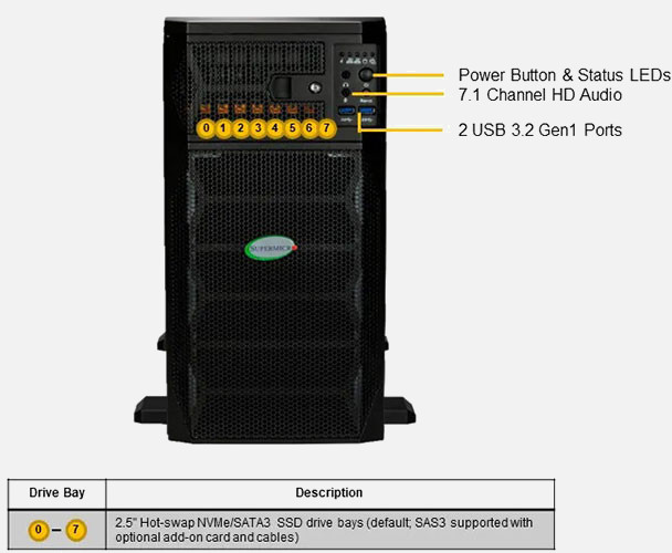 The Supermicro GPU SuperServer 751GE-TNRT | SYS-751GE-TNRT can be configured with 2.5" drives, a more space efficient and low noise option. These drives also offer energy savings and increased flexibility.
