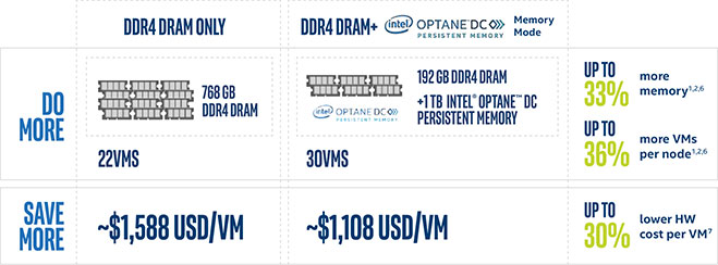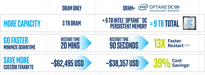 Intel Optane Persistent Memory is more cost-efficient than DRAM and its ability to increase capacity is far beyond what DRAM is capable of.