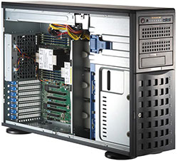 Ideal for HPC, AI, industrial automation, analytics server. 8x PCI-E 5.0 x16 (LP) slots, 2x PCI-E 5.0 x8 FHFL slots. Redundant 3000W Titanium Power Supply, 20x 2.5" hot-swap NVMe/SATA drive bays