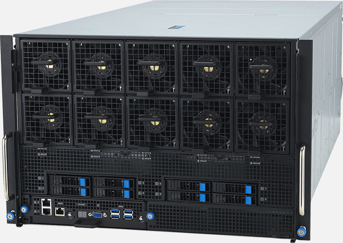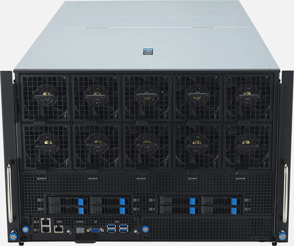 7U, Dual 5th Gen Xeon® Platinum 8558 Processors, 8x NVIDIA HGX H200 GPU cards, 4+2 3000W redundant power supply, 8x 2.5" NVMe & 2x 2.5" NVMe/SATA/SAS hot-swappable drive bays.