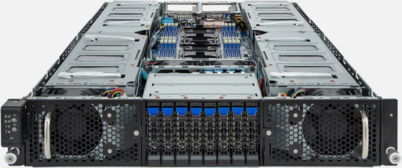 Dual 4th Gen Intel Xeon Scalable Processors, Supports up to 8x double slot GPU cards, 2x 10Gb/s BASE-T LAN ports (Broadcom® BCM57416), 8x 2.5" SATA/SAS hot-swappable drive bays.