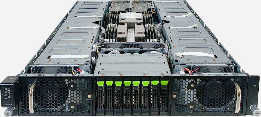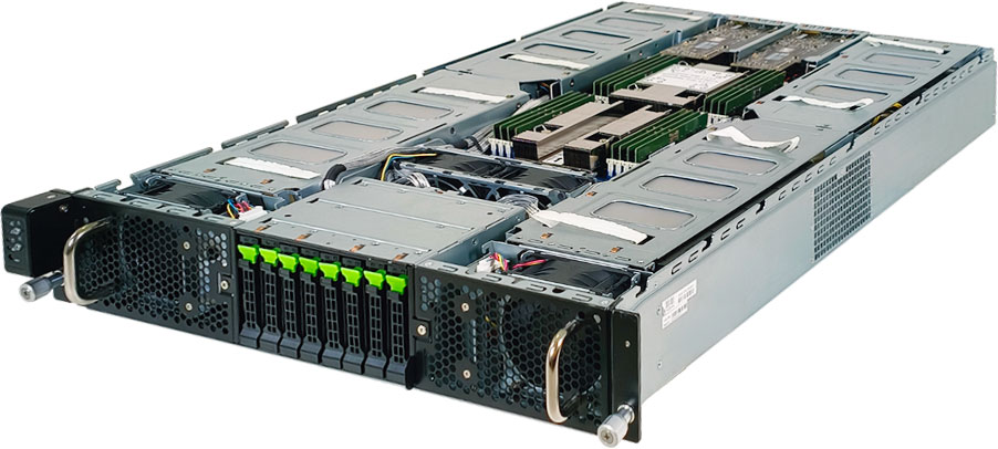 Dual 4th/5th Gen Intel Xeon Scalable Processors, NVIDIA OVX™ L40S Server with 4 GPUs, 2x 10Gb/s BASE-T LAN ports (Broadcom® BCM57416), 8x 2.5" NVMe/SATA hot-swappable drive bays.