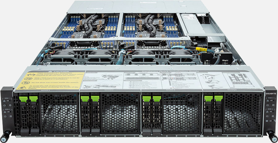 Water Cooling, Quad Node, Dual 4th Gen Intel Xeon Scalable Processors (Per Node), 4x LP PCIe Gen5 x16 slots, 3000W Redundant Power Suppply, 8x 2.5" NVMe/SATA/SAS hot-swappable drive bays.