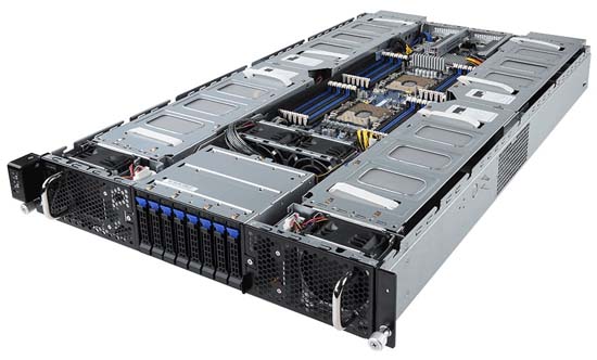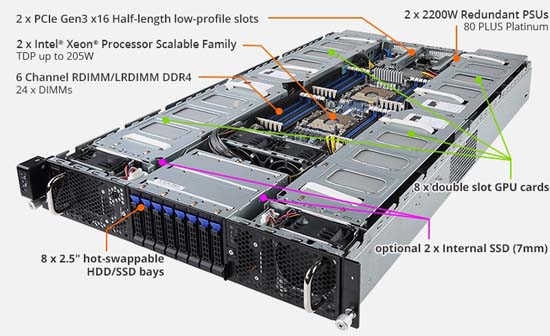 Supports up to 8x double slot GPU cards, 2x 10Gb/s BASE-T LAN ports, redundant power option, 8x 2.5" hot-swappable HDD/SSD bays