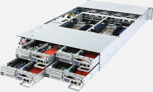 2U - 4 nodes with rear access to the node trays. 8 x 10Gb/s LAN ports. Aspeed® AST2500 remote management controller. Redundant power supply,