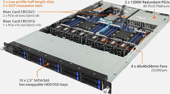 Redundant power option, 10x 2.5" SATAIII hot-swappable HDD/SSD bays, 3x PCIe Gen3 expansion slot