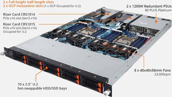 10x 2.5" U.2 hot-swappable HDD/SSD bays, dual 1Gb/s LAN ports (Intel® I350-AM2), redundant power option.
