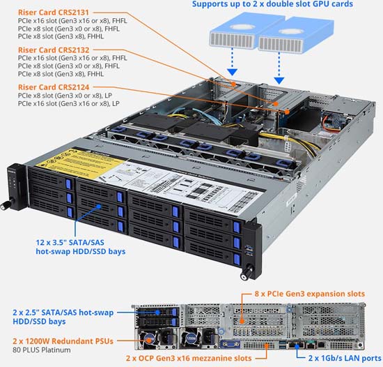 The Gigabyte R281-3C2 (6NR2813C2MR-00), powered by the Intel Xeon SP family, has a huge 3TB maximum RAM capacity and comes with 12x 3.5” or 2x 2.5” SATA hot-swappable HDD/SSD drive bays.