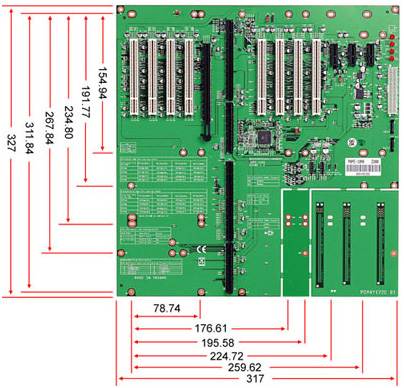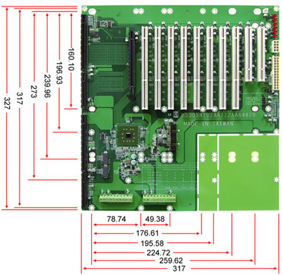 Fit for 14-slot chassis ATX power connector support 9 ISA / 4 PCI usable Back Plane. 317(L) x 257(W) mm;12.48"(L) x 10.12"(W).