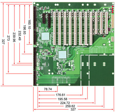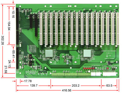 14-slot (7xPCI) active PICMG backplane. Fit for any 14-slot chassis ATX power connector support Suitable for advanced CTI application. 317(L) x 257(W) mm;12.48"(L) x 10.12"(W).