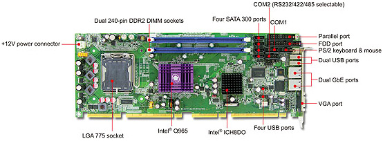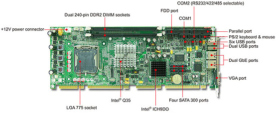- Rich I/O connections such as FDD, two Gigabit Ethernet, serial ports, parallel port, USB 2.0, and SATA ports