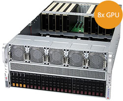 Ideal for HPC, AI, Deep Learning, cloud gaming, VDI, rendering and animation. 13x PCI-E 5.0 x16 slots. Redundant 2700W Titanium Power Supply, 8x 3.5"/2.5" hot-swap NVMe/SATA drive bays