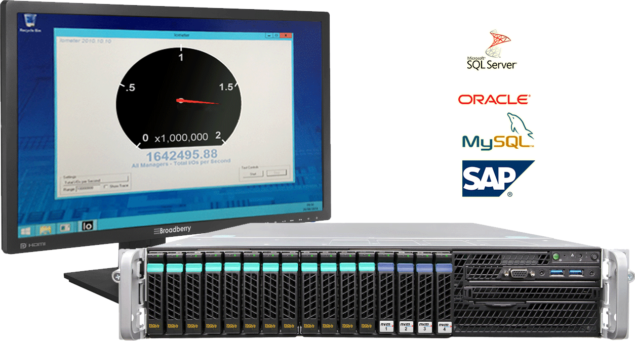 IOPS-hungry applications like Oracle, SQL, and SAP can move business faster, better inform decisions, and improve customer service, but providing the performance they need can be costly. By taking advantage of the latest NVMe technology, the Broadberry SQL appliance can reduce latency by up to 90% and use 84% less rack space, for 80% lower cost/GB than conventional spinning disk solutions.