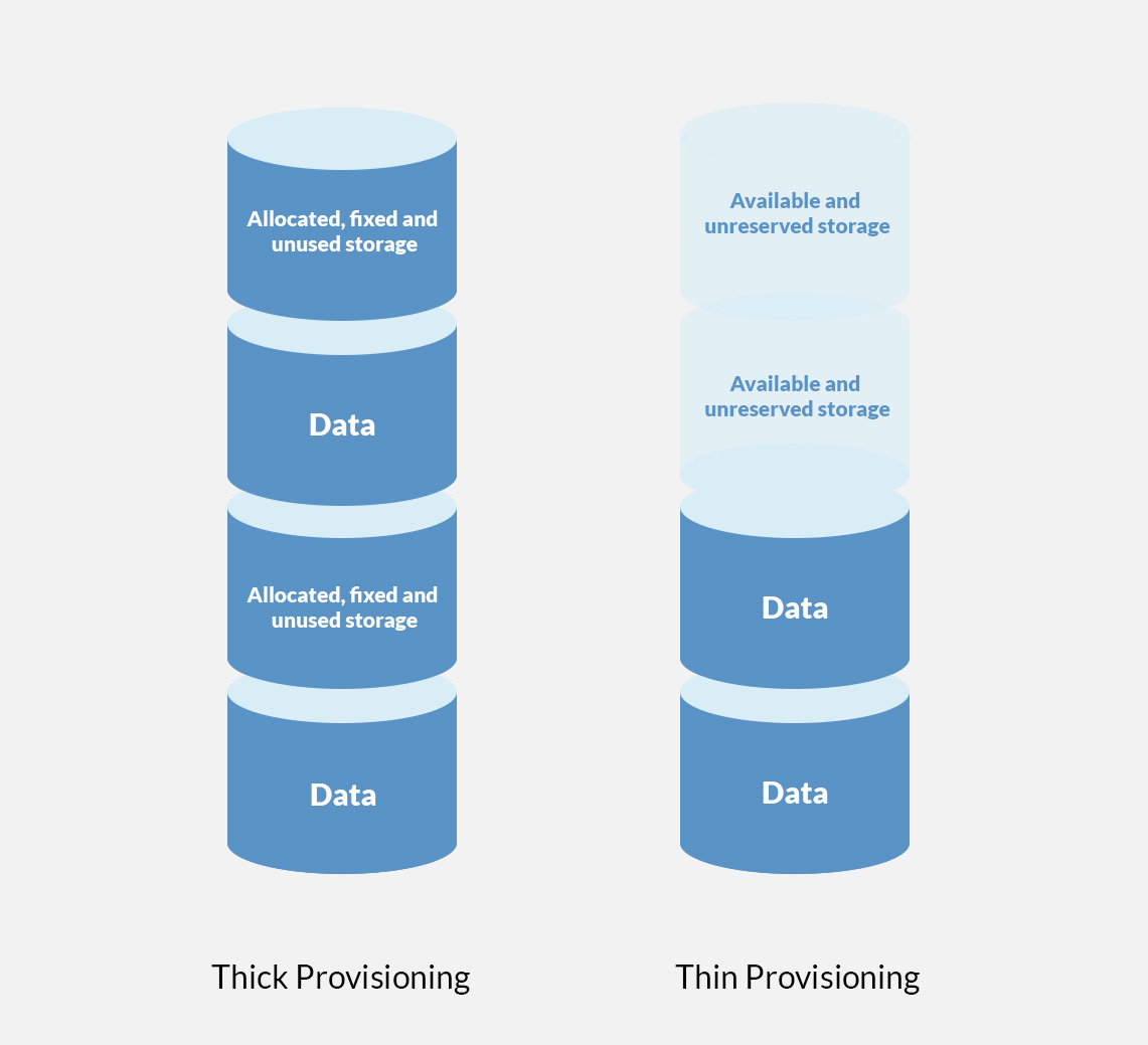 As space is pre-allocated, thick provisioning guarantees there will be enough capacity available. Whereas thin provisioning is more flexible and allows you to get the most out of the storage space available.