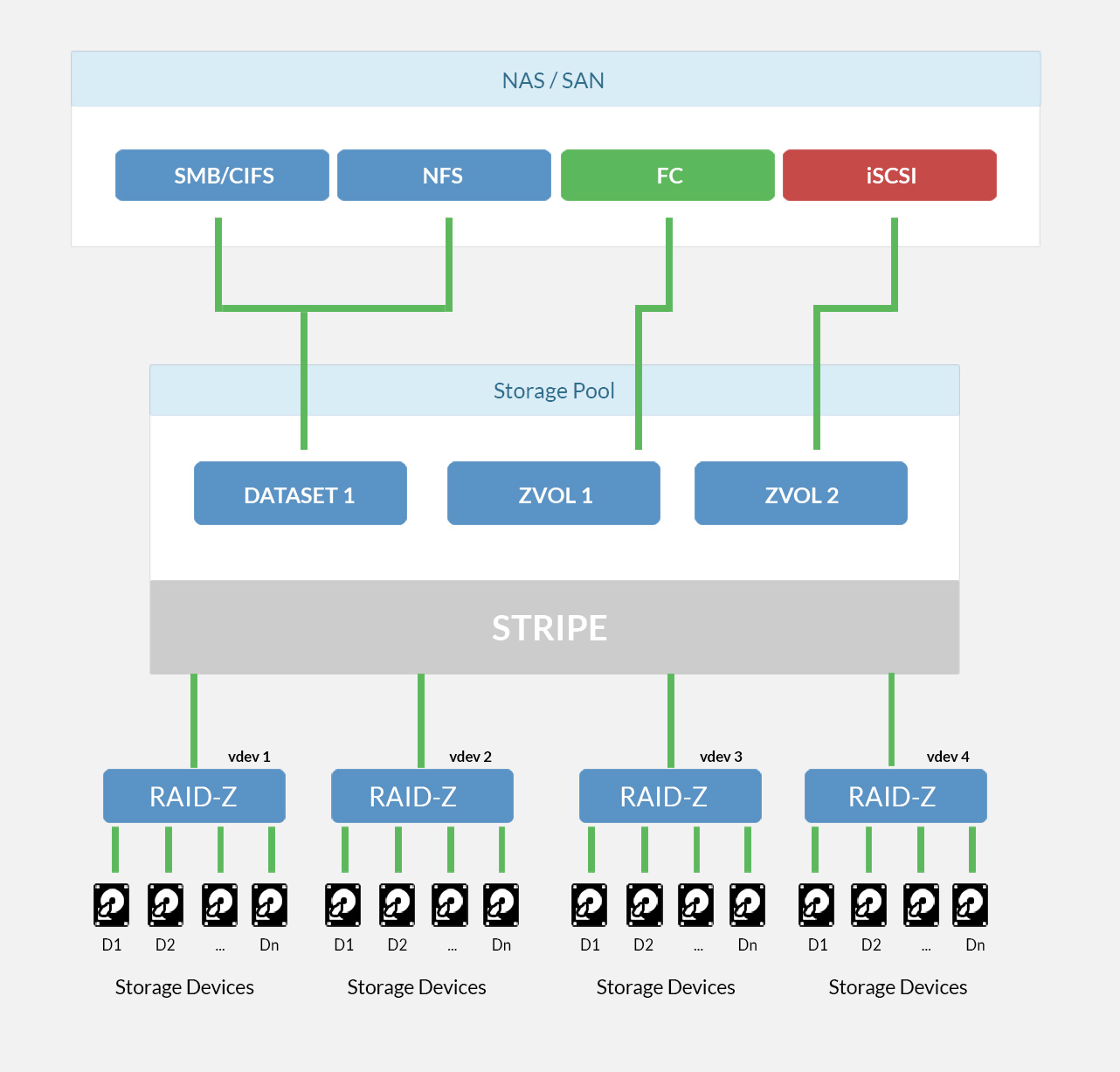ZFS removes the problem of storage islands. It offers a full all-in-one solution with advanced management features. ZFS file system is cross-platform with multiple access protocols: iSCSI, Fibre Channel (FC), NFS, SMB (CIFS). Storage management is flexible, data is organised into pools and then further into zvols (for block-based storage) and datasets (for file-based storage). Available data storage is efficiently utilised via thin and over provisioning.