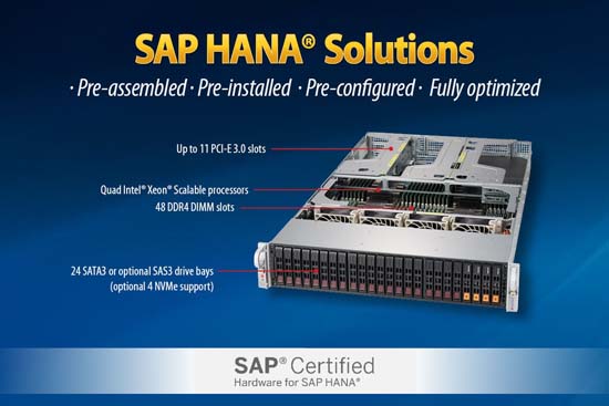 SAP HANA Certified Supermicro Server SAP-HANA-CERTIFIED-SYS-2049U-TR4 is powered by quad Intel Xeon Scalable processors and can be configured with 3TB of RAM.