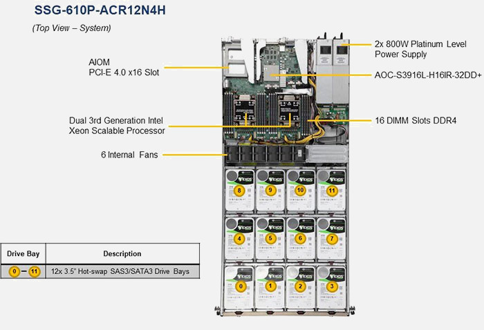 The Supermicro Storage SuperServer SSG-610P-ACR12N4H | SSG-610P-ACR12N4H supports the Intel Intel Xeon Scalable Processors 3rd Generation family in a high-density 1U form-factor. These SuperServers are ideal for network infrastructure, front-end enterprise, and minimal-downtime cluster server systems.