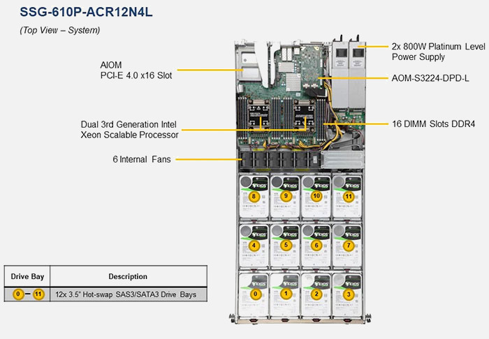 A 1U Supermicro SuperServer based on 2x Intel 3rd Gen Intel Xeon Scalable Processor (X12) range of processors, the Supermicro Storage SuperServer SSG-610P-ACR12N4L | SSG-610P-ACR12N4L is configurable with up to 14x Hot-Swap Drives drive bays, and designed for optimal performance with 16x 3200Mhz DDR4 memory sockets .