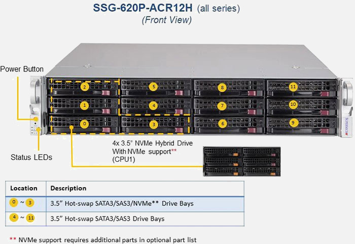 The Supermicro Storage SuperServer SSG-620P-ACR12H | SSG-620P-ACR12H supports the Intel Intel Xeon Scalable Processors 3rd Generation family in a high-density 2U form-factor. These SuperServers are ideal for network infrastructure, front-end enterprise, and minimal-downtime cluster server systems.