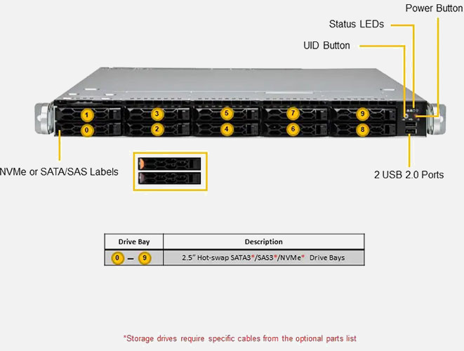 The Supermicro Cloud DC SuperServer 121C-TN10R | SYS-121C-TN10R can be configured with 2.5" drives, a more space efficient and low noise option. These drives also offer energy savings and increased flexibility.