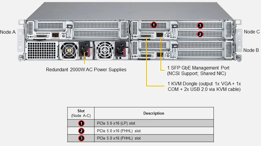 • 2x PCIe Gen5 x16 FHHL slot and 1 PCIe Gen5 x16 HHHL slot (per node)