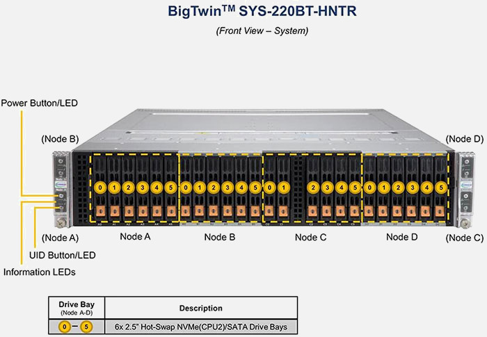 The Supermicro BigTwin SuperServer SYS-220BT-HNTR | SYS-220BT-HNTR can be configured with 2.5" drives, a more space efficient and low noise option. These drives also offer energy savings and increased flexibility.