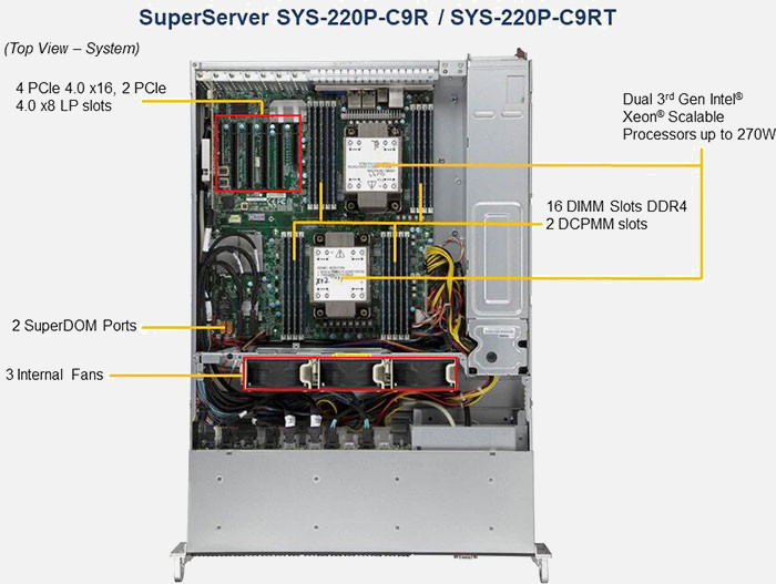 The Supermicro SuperServer SYS-220P-C9R | SYS-220P-C9R supports the Intel Intel Xeon Scalable Processors 3rd Generation family in a high-density 2U form-factor. These SuperServers are ideal for network infrastructure, front-end enterprise, and minimal-downtime cluster server systems.