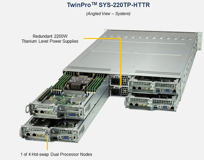 The Supermicro Twin SuperServer SYS-220TP-HTTR | SYS-220TP-HTTR supports the Intel Intel Xeon Scalable Processors 3rd Generation family in a high-density 2U form-factor. These SuperServers are ideal for network infrastructure, front-end enterprise, and minimal-downtime cluster server systems.