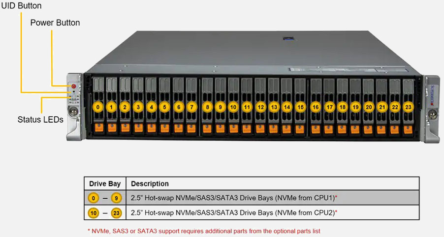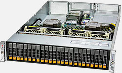 The Supermicro Hyper SuperServer 221H-TN24R | SYS-221H-TN24R can be configured with 2.5" drives, a more space efficient and low noise option. These drives also offer energy savings and increased flexibility.