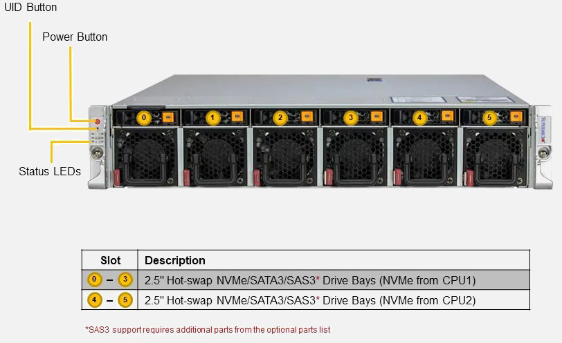 Dual 4th Gen Intel Xeon Scalable processors, Ideal for AI, Machine Learning, Cloud Computing, Edge and Network Function Virtualisation. Up to 6x PCI-E 5.0 x16 FHFL slots, 2x PCI-E 5.0 x16 FHHL slots. Redundant 1300W Power Supply, 6x 2.5" hot-swap NVMe/SATA/SAS drive bays
