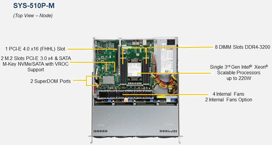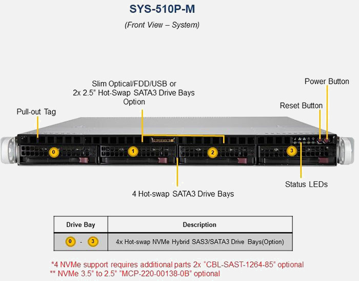 The Supermicro UP SuperServer SYS-510P-M | SYS-510P-M features hot-swap hard drives, giving you more flexibility and allowing you to remove drives without having to shut down the system.