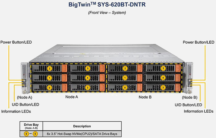 The Supermicro BigTwin SuperServer SYS-620BT-DNTR | SYS-620BT-DNTR features hot-swap hard drives, giving you more flexibility and allowing you to remove drives without having to shut down the system.