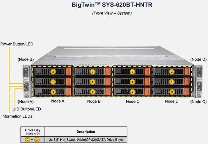 The Supermicro BigTwin SuperServer SYS-620BT-HNTR | SYS-620BT-HNTR features hot-swap hard drives, giving you more flexibility and allowing you to remove drives without having to shut down the system.
