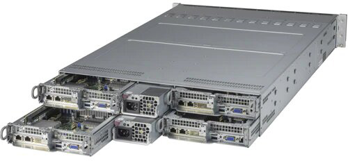 4 node systems ideal for hyperconverged infrastructure, HPC and big data. 16 DIMMs of memory and Intel® X710 Dual port 10GBase-T LAN onboard per node. Redundant power supplies.