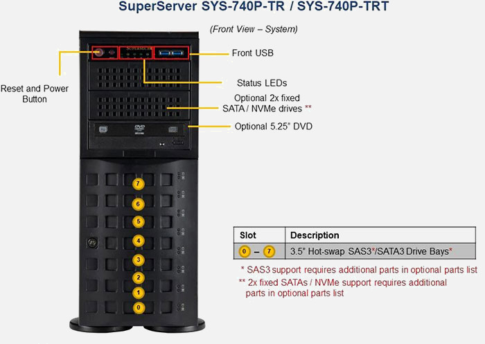 The Supermicro SuperServer SYS-740P-TR | SYS-740P-TR features hot-swap hard drives, giving you more flexibility and allowing you to remove drives without having to shut down the system.