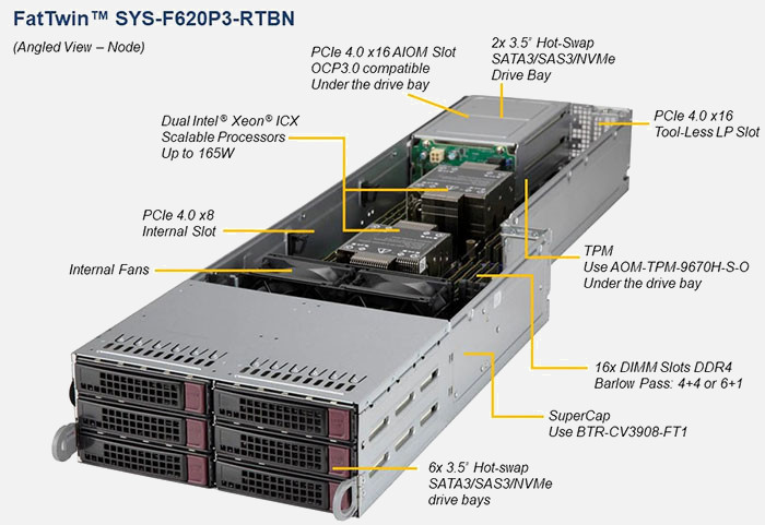 The Supermicro FatTwin SuperServer SYS-F620P3-RTBN | SYS-F620P3-RTBN supports the Intel Intel Xeon Scalable Processors 3rd Generation family in a high-density 4U form-factor. These SuperServers are ideal for network infrastructure, front-end enterprise, and minimal-downtime cluster server systems.