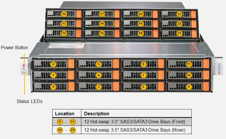 The Supermicro Storage A+ Server 2015S-E1CR24H | ASG-2015S-E1CR24H features hot-swap hard drives, giving you more flexibility and allowing you to remove drives without having to shut down the system.